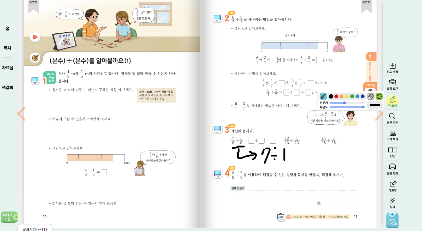 우측의 '펜쓰기'기능을 활용하여 학생들에게 풀이 과정을 직접 보여주면서 수업을 진행하실 수 있습니다.