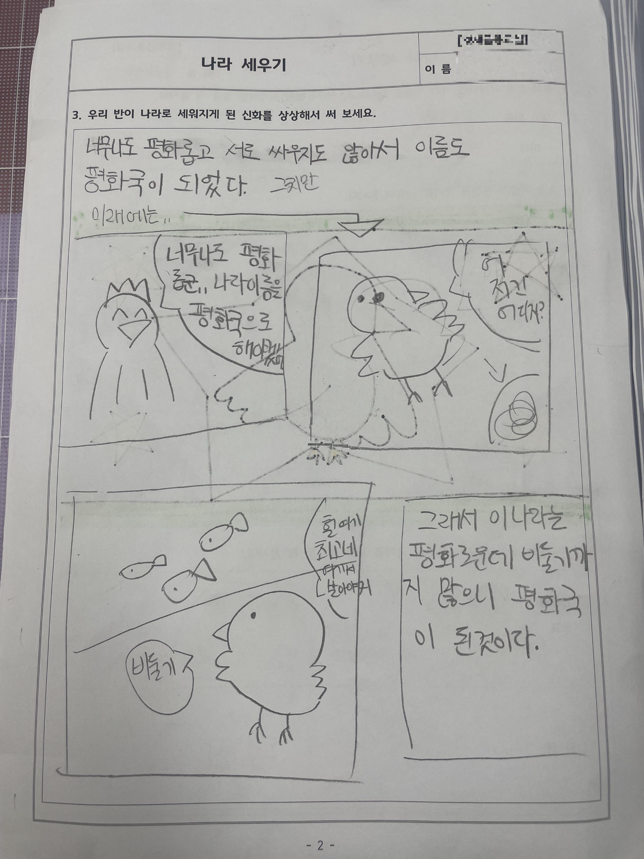 - 국가 이름과 국기를 만들었으면 나라가 만들어지게 된 건국신화를 간단히 만들어 볼 수 있도록 합니다. (조금 더 몰입도를 높이고 소속감을 느낄 수 있도록 하기 위함입니다.)