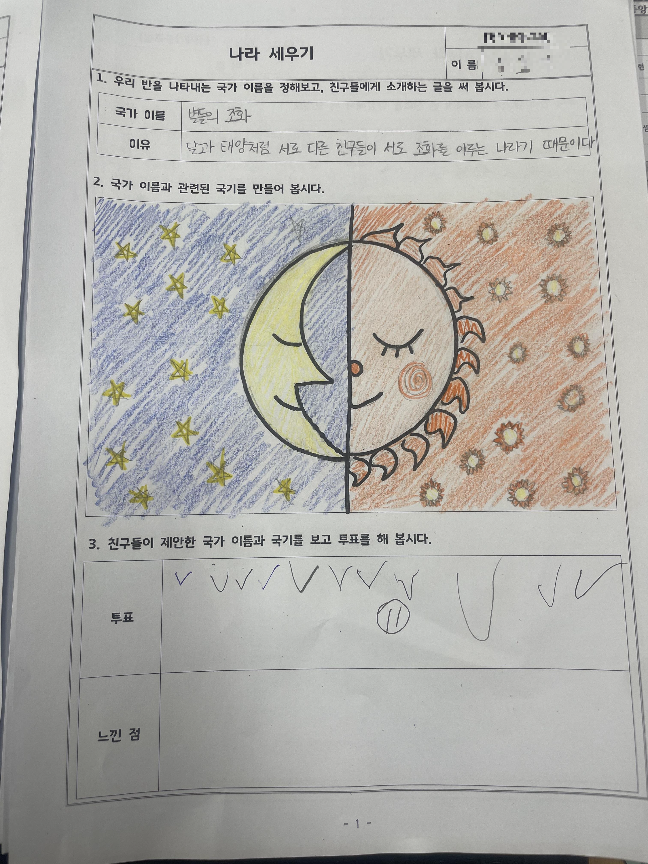 - 이 때 국기에는 꼭 국가이름과 비전 등 의미가 담길 수 있도록 만들어보도록 안내해야 합니다.